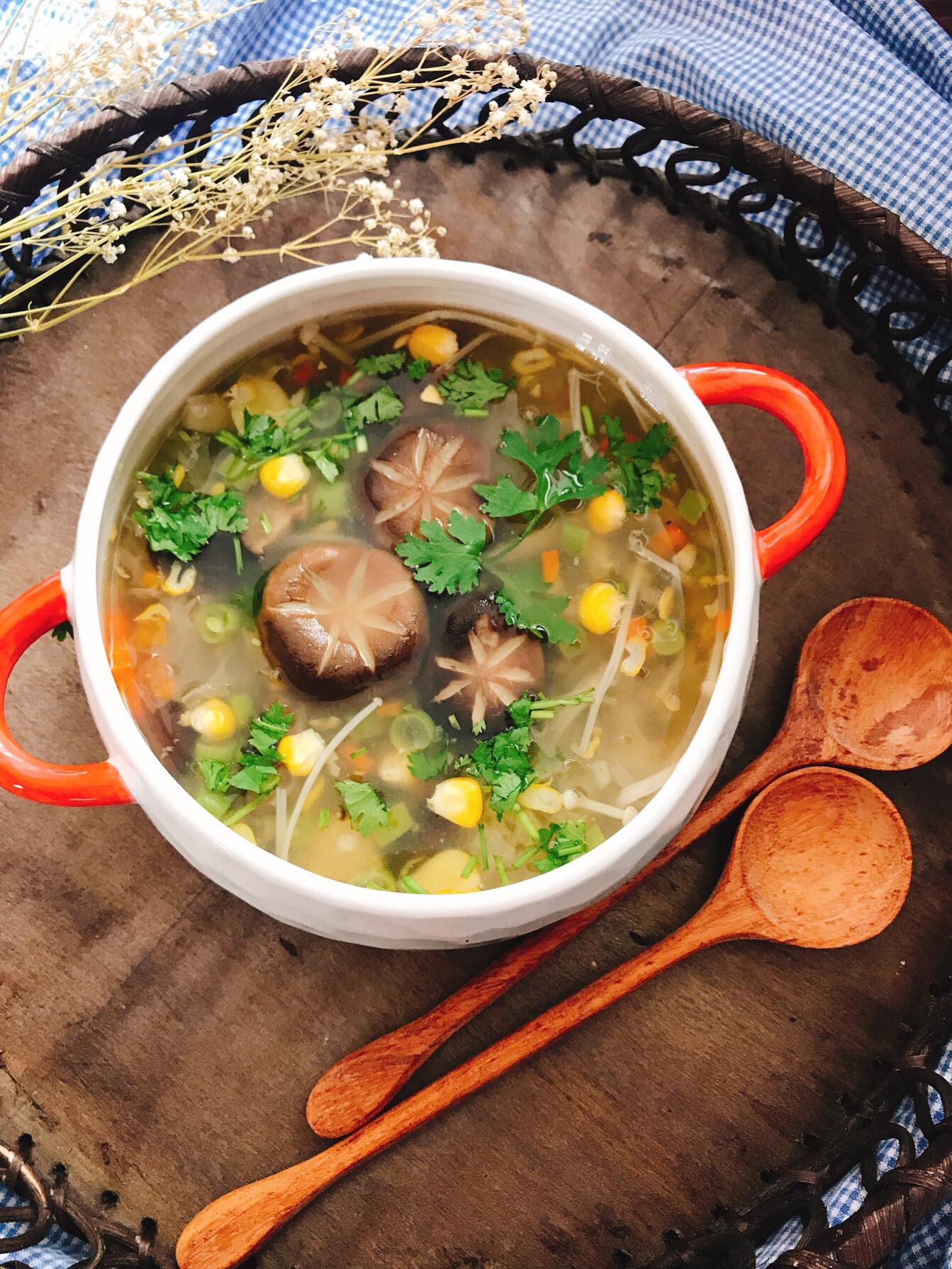 - Cho nấm đông cô, ngô ngọt tách hạt, cà rốt thái hạt lựu, đậu cove thái hạt lựu vào nồi nước súp, nêm hạt nêm vừa ăn. Để sôi khoảng 5-7 phút, cho tiếp nấm ngọc châm, nấm đông trùng hạ thảo, nấm bào ngư, nấm kim châm vào nồi nấu thêm vài phút. Bột năng hòa với ít nước cho vào nồi súp khuấy đều hơi sánh thì tắt bếp. Cho tiêu, hành, ngò vào là có thể thưởng thức.