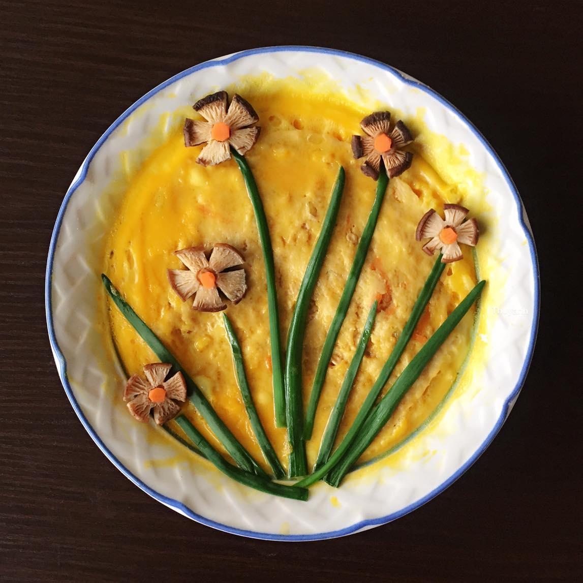 Đập trứng ra bát, đánh đều để lòng đỏ và lòng trắng quyện vào nhau. Cho nấm, cà rốt, hành khô, gia vị vào trứng, tiếp tục đánh đều. Bỏ vào nồi hấp khoảng 20 phút là chín. Dùng mũ nấm, hành lá và cà rốt để trang trí cho đẹp mắt.
